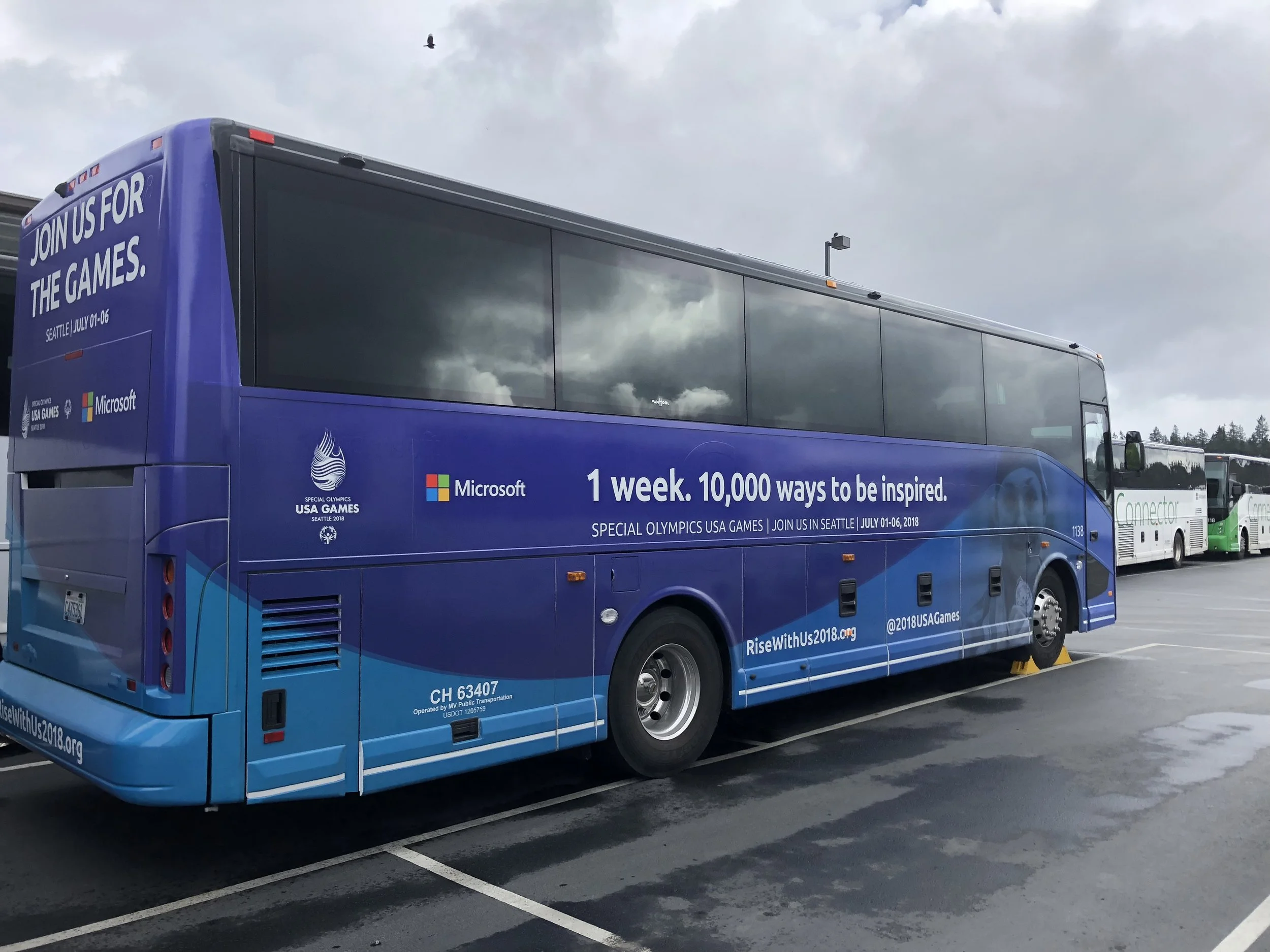 As a member of the SuperGraphics team I was also honored to be involved in a Microsoft Connector Bus Wrap featuring the USA Special Olympics. The usual connector wraps are white with green lettering and Microsoft logos, if you frequent the Eastside in Washington you have most likely seen them on I-5, I-405 and throughout the South Seattle and Seattle areas. Instead, these were two striking hues of blue and featured inspiring imagery and headlines. My favorite: “1 Week. 10,000 ways to be inspired. Rise with Us.”