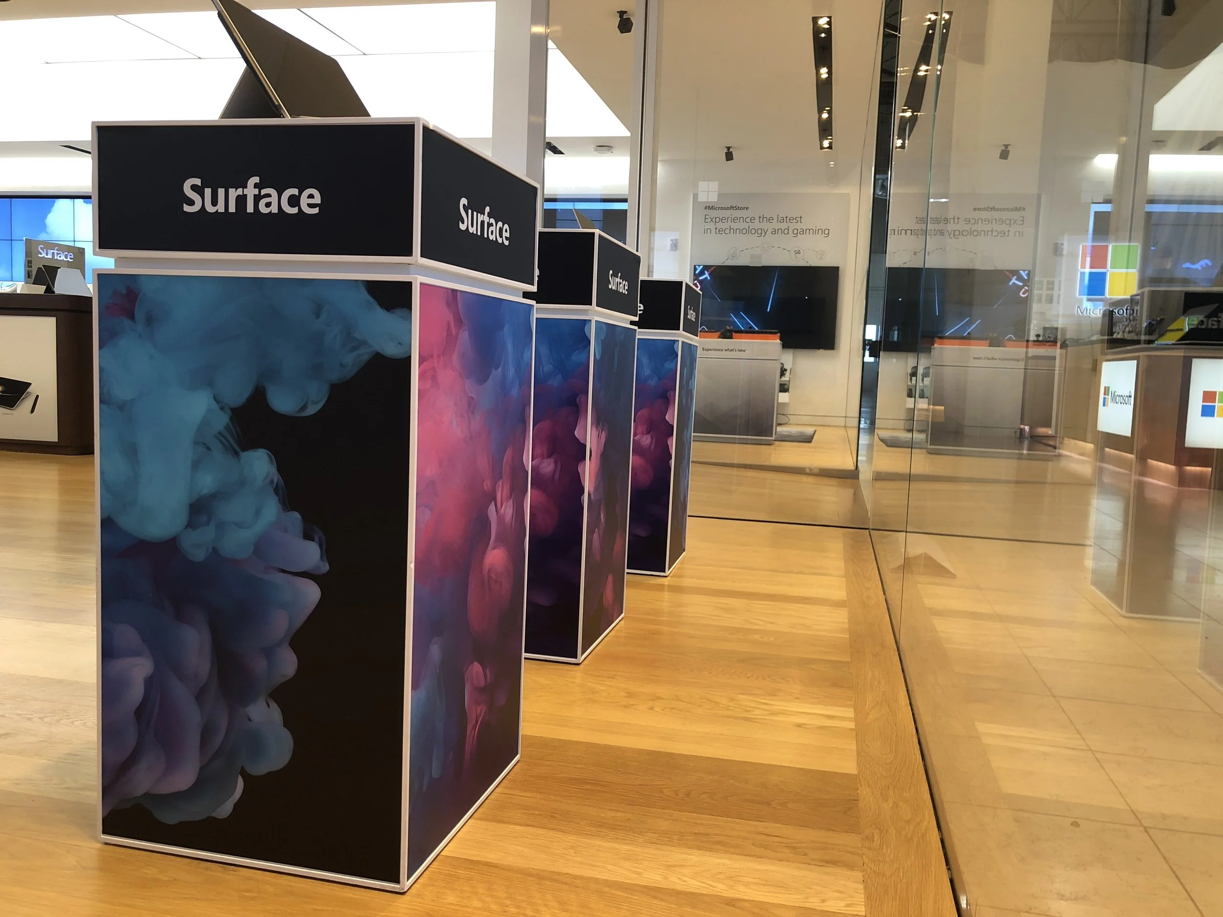 Microsoft Retail stores had over 100 nationwide locations all with large format graphics that updated multiple times per year for retail moments and product releases, including fabric faced lightboxes, magnetic signage, pedestals, focus traits and much more; each location differed. In 2018, the team pitched the idea to do a full window graphic takeover across the stores overnight for the Holiday campaign. It had never been done before. Leadership team agreed after we created a convincing mock-up of “static cling window graphics vs. traditional vinyl” in Store Zero which would be easy to remove once the moment had passed and could be demonstrated. Store managers took site survey photos and measurements, agencies completed design mockups, nationwide installers were hired, all coordinated by cross-functional teams. The launch was extremely successful with a few minor hiccups that were found at about 8 locations and were resolved within 24 hours. And this was only 1 of the many sets for the year.