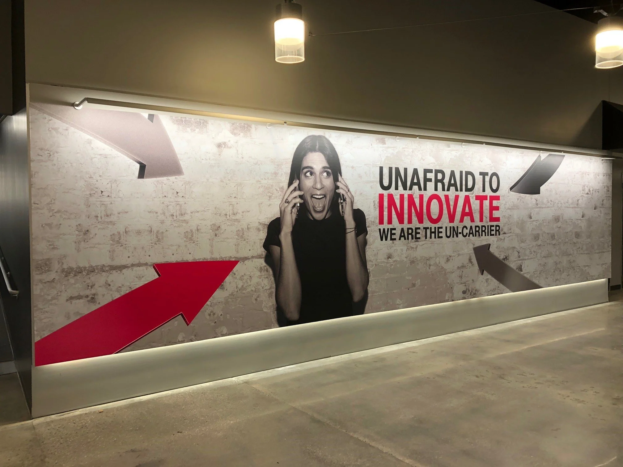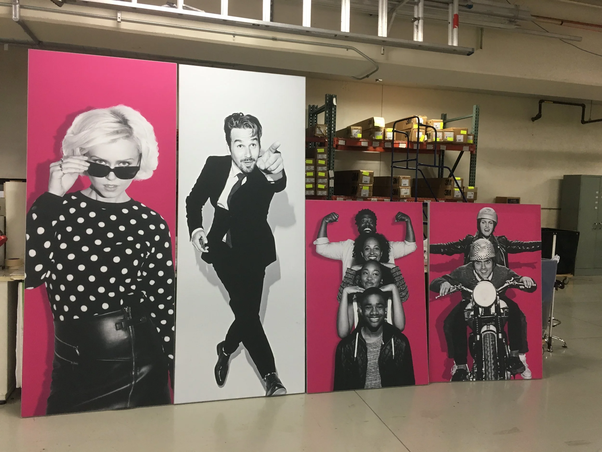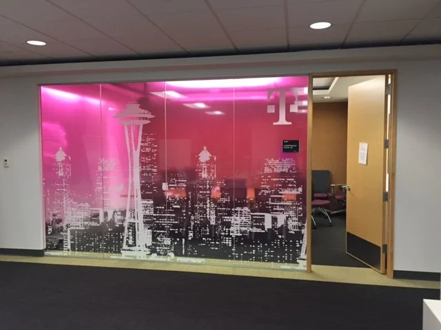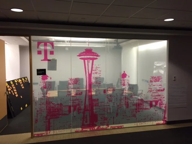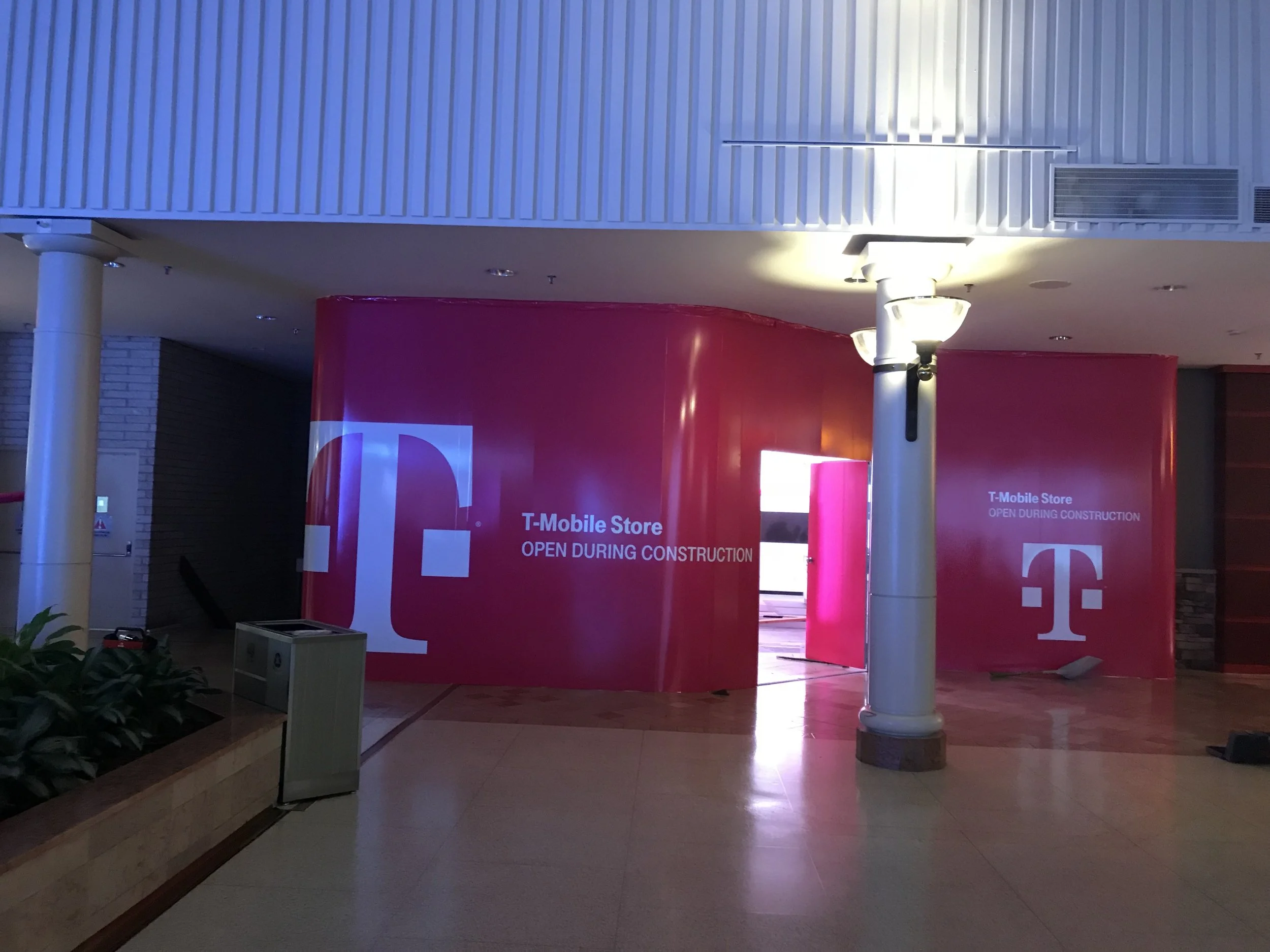 SuperGraphics is a large format printer specializing in experiential graphics for environments, retail, event, and fleet; with many national giant companies. One of their clients was T-Mobile the Uncarrier. Everything from entire retail store signage sets, to construction wall barricade signage to corporate office decor requests including fabric faced lightboxes, snap frame art, dimensional logos and lettering, illuminated wall signage, wall murals, vinyl window graphics and more. If you know anything of T-Mobile you are most likely aware of their “Magenta” color choice, I learned quickly that this is not to be called “pink” but you would likely be just as surprised to know that hitting that exact shade of 100% magenta across digital, physical, print, lit, unlit and paint mediums is an obstacle that boggles the mind but this happens to be one of my particular specialties as a creative producer. The complexity of the match is monumental since everything is displayed all at once in the same area. There is very little forgiveness for mismatches in an instance like this. To set about this task: start somewhere, for me that was assembling everything we had thus far and then “dialing it in” from there. Particularly challenging was the paint match, the current choice left much to be desired and was “murky” missing the signature “pop” that the brand itself commands. Working with our team of experts, the paint manufacture specialists plus a lot of trial and error we remedied this and got back on track with a formula that everyone was very happy with!